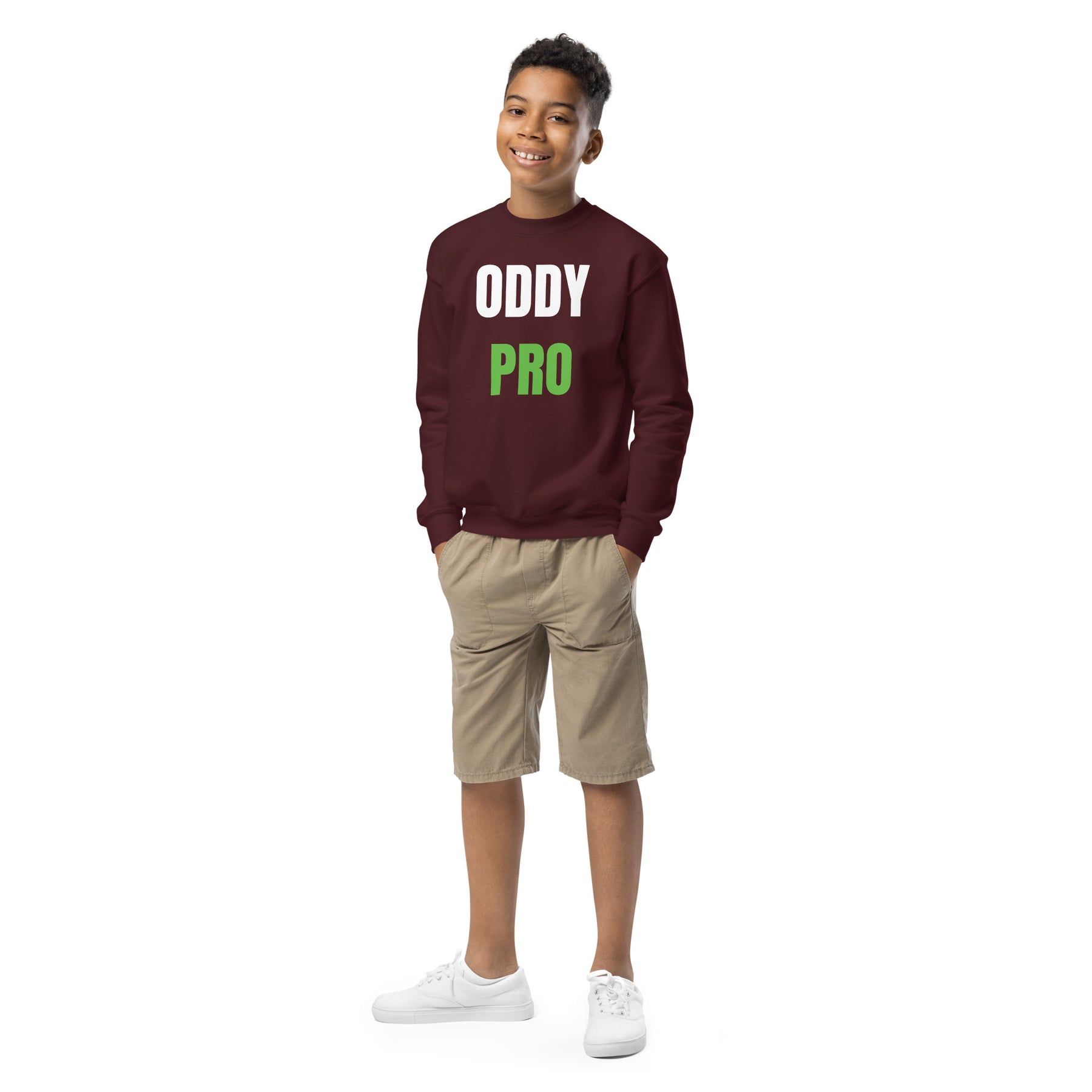 Oddy Pro Youth crewneck sweatshirt in maroon with bold white and green lettering.