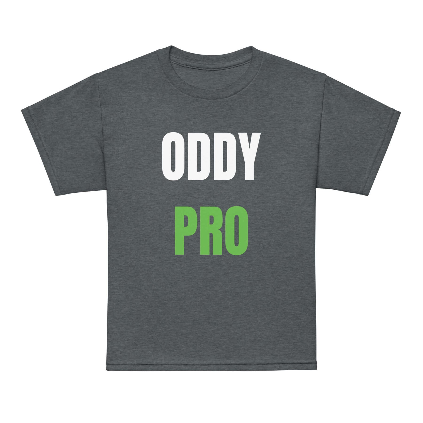 Oddy Pro Youth t-shirt in dark color featuring bold white and green lettering, perfect for active days.