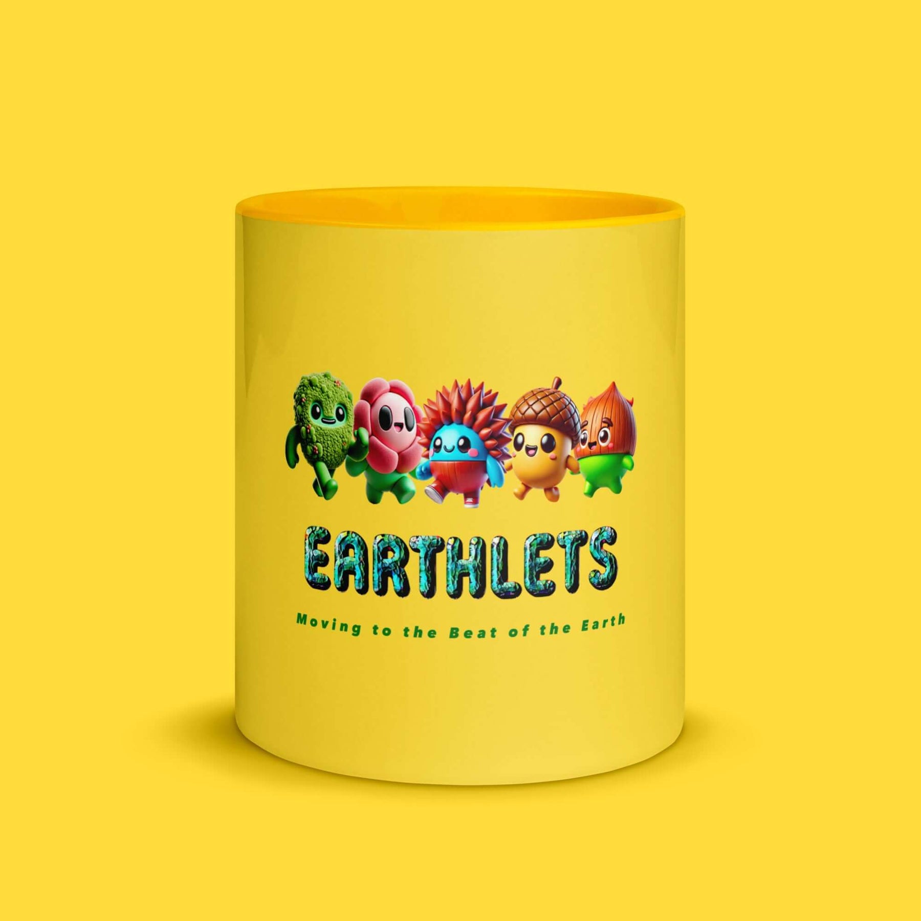 Earthlets mug featuring colorful characters with a yellow interior, promoting eco-awareness and creativity.